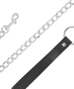 The chain link leash attaches to the D-ring on the collar via a swivel hook, ending with a looped leash to hold while you guide your pet, admiring its movement.
