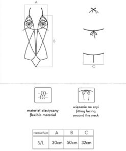 A tiny, sensual bodysuit will ignite your imagination and turn the evening into an unforgettable experience. The Luisina bodysuit consists of a delicate lace bra and a thong with a charming rose motif. The thong and bra are connected with a tangle of straps that emphasizes the waist and feminine curves. A bra that partially reveals the breasts while slightly lifting them adds an incredible touch to the whole look. The cleverly arranged straps that flow down between the breasts to the thong optically stylize the figure. The practically exposed hips and shoulders, as well as the thong, are adorned with a lace bralette. Like the back and buttocks, which are decorated only with a thong strap and two straps, make it a daring proposition for her.